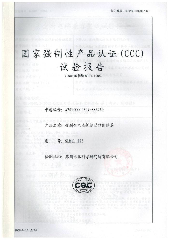 SLM1L-225塑殼斷路器資質(zhì)證書