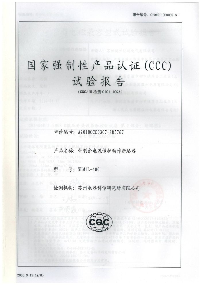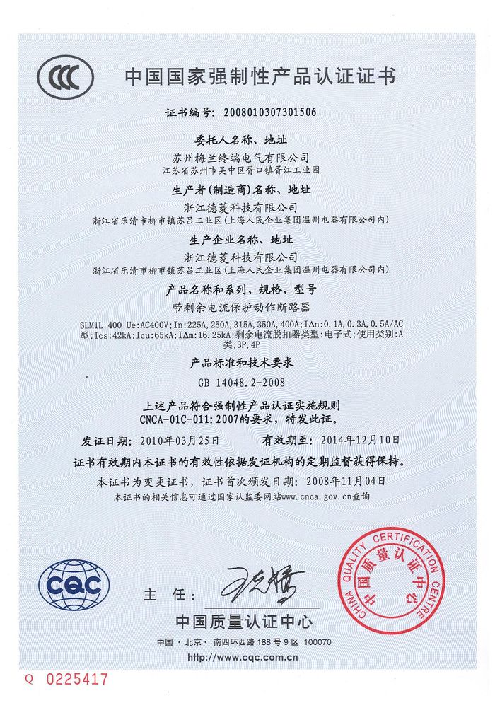 SLM1L-400塑殼斷路器資質(zhì)證書(shū)