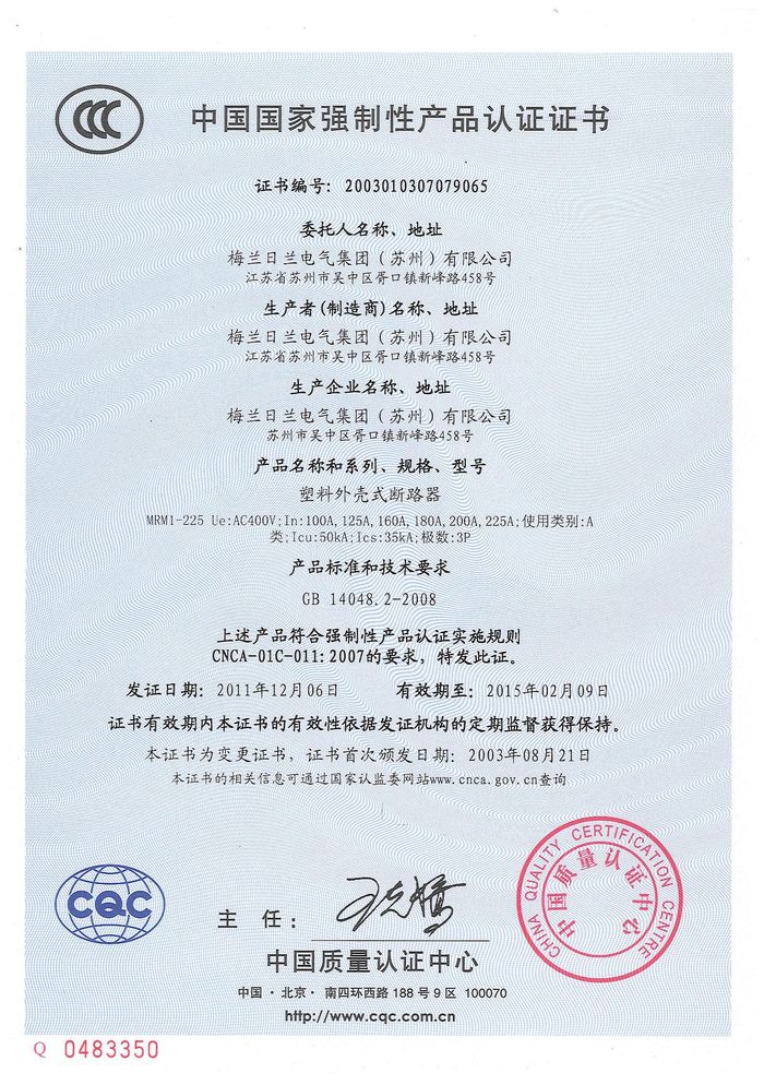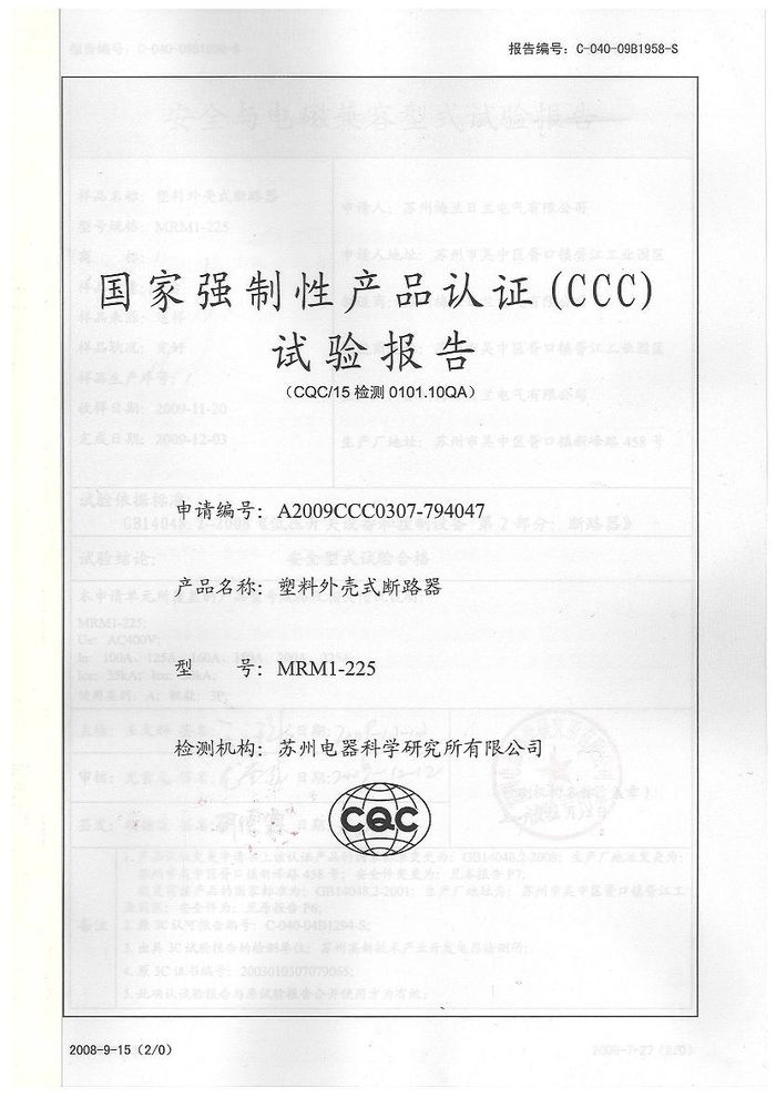 MRM1-225塑殼斷路器資質(zhì)證書