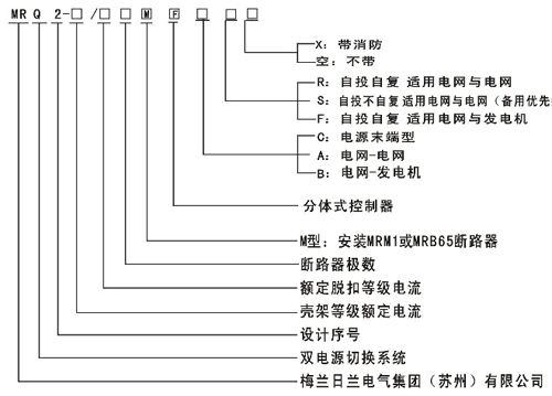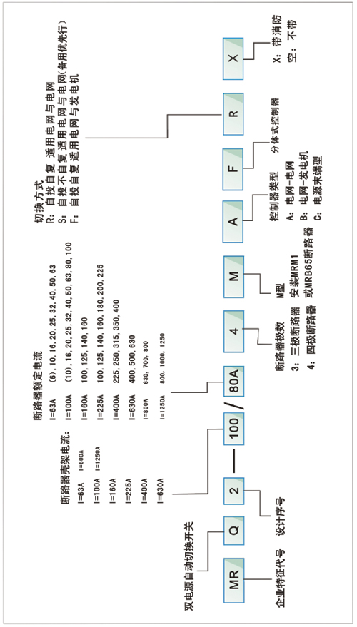 用戶在訂貨時應按第4項的型號及含義注明智能系統(tǒng)的型號,規(guī)格斷路器框架電流、極數(shù)、額定脫扣電流、功能、切換方式。 例如:MRQ2-100/63/4M/B/R智能雙電源自動切換系統(tǒng),塑殼斷路器殼架電流為100A,額定脫扣電流為63A,四級、電網(wǎng)對發(fā)電、自投自復。