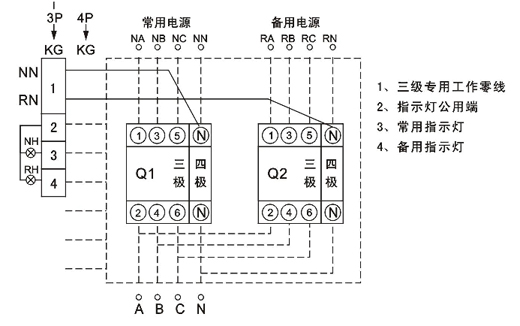 開關(guān)工作有三個狀態(tài)位置供用戶選擇:常用電源(N)合、雙分、備用電源(R】合,開關(guān)具